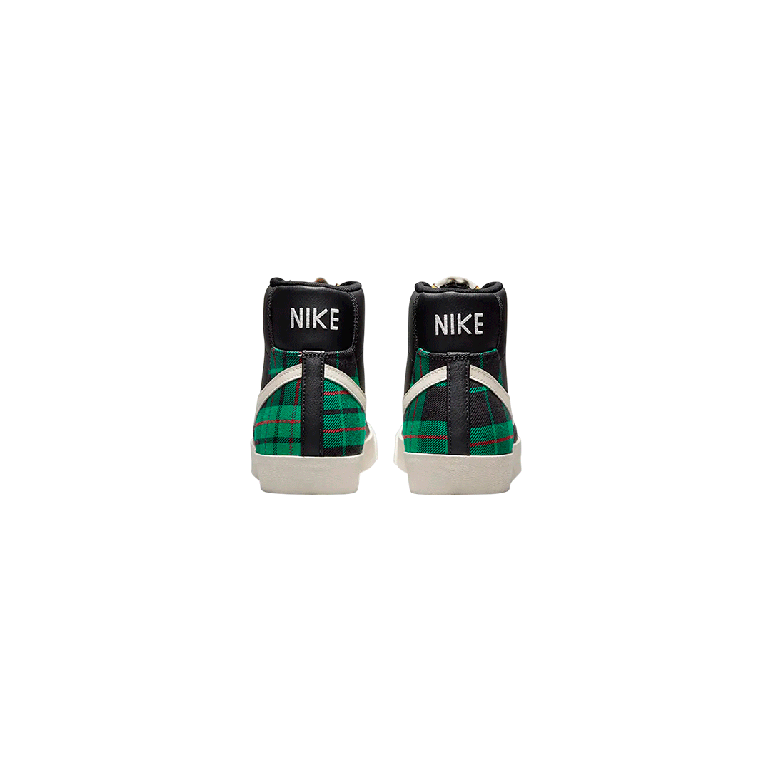 Esta Blazer de corte medio luce una parte superior de cuero casi completamente negro, lisa en la base y abatanada en las capas superpuestas. Los cordones planos tejidos le siguen el mismo patrón. Los distintivos Swooshes de cuero abatanado blanco puro en ambas zapatillas destacan sobre el fondo negro intenso. Sin embargo, lo que le da carácter a esta zapatilla son los paneles del talón en un verde tartán escocés, ideal para el solsticio de invierno. La marca negra destaca en la lengüeta blanca, mientras que en la lengüeta del talón se encuentra el logo Nike bordado en blanco sobre cuero abatanado negro. Una suela completamente blanca con dibujo de espiga completa el look de estas zapatillas.